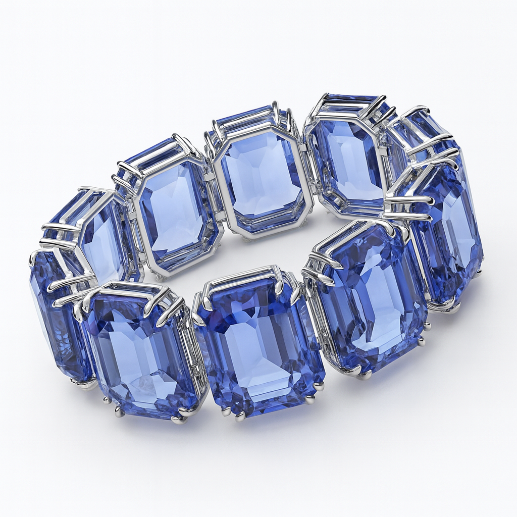 深みのあるアイスブルーが美しい天然ブルーカイヤナイトを、エメラルドカットで整然と配したプラチナ950製のブレスレット。石ひとつひとつが高い透明度と強い光の反射を持ち、手首の動きに合わせて優雅に輝きます。