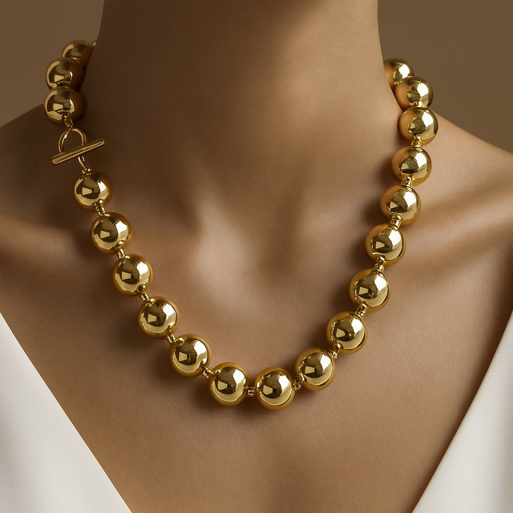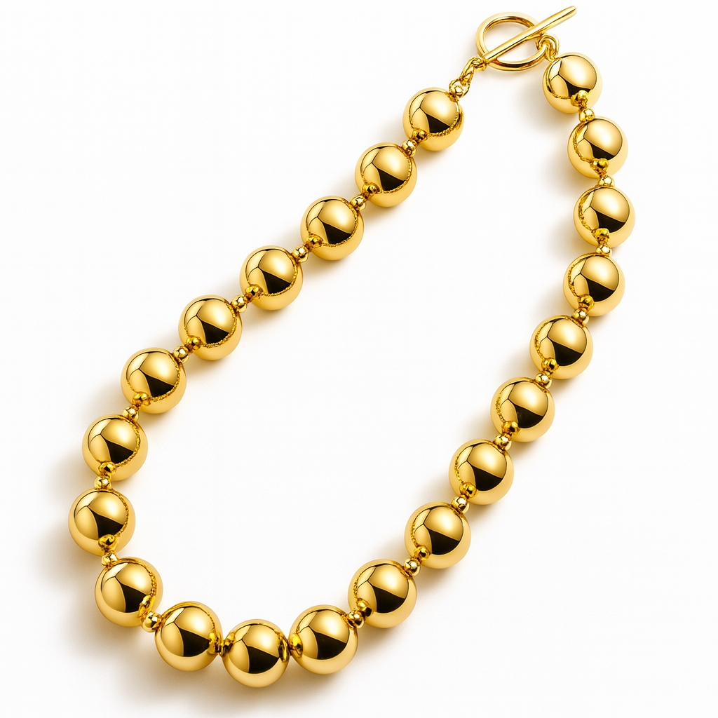 ひとつひとつ丁寧に磨き上げられたK18イエローゴールドのスフィア(球体)を連ねた、シンプルながら圧倒的な高級感を放つネックレス。