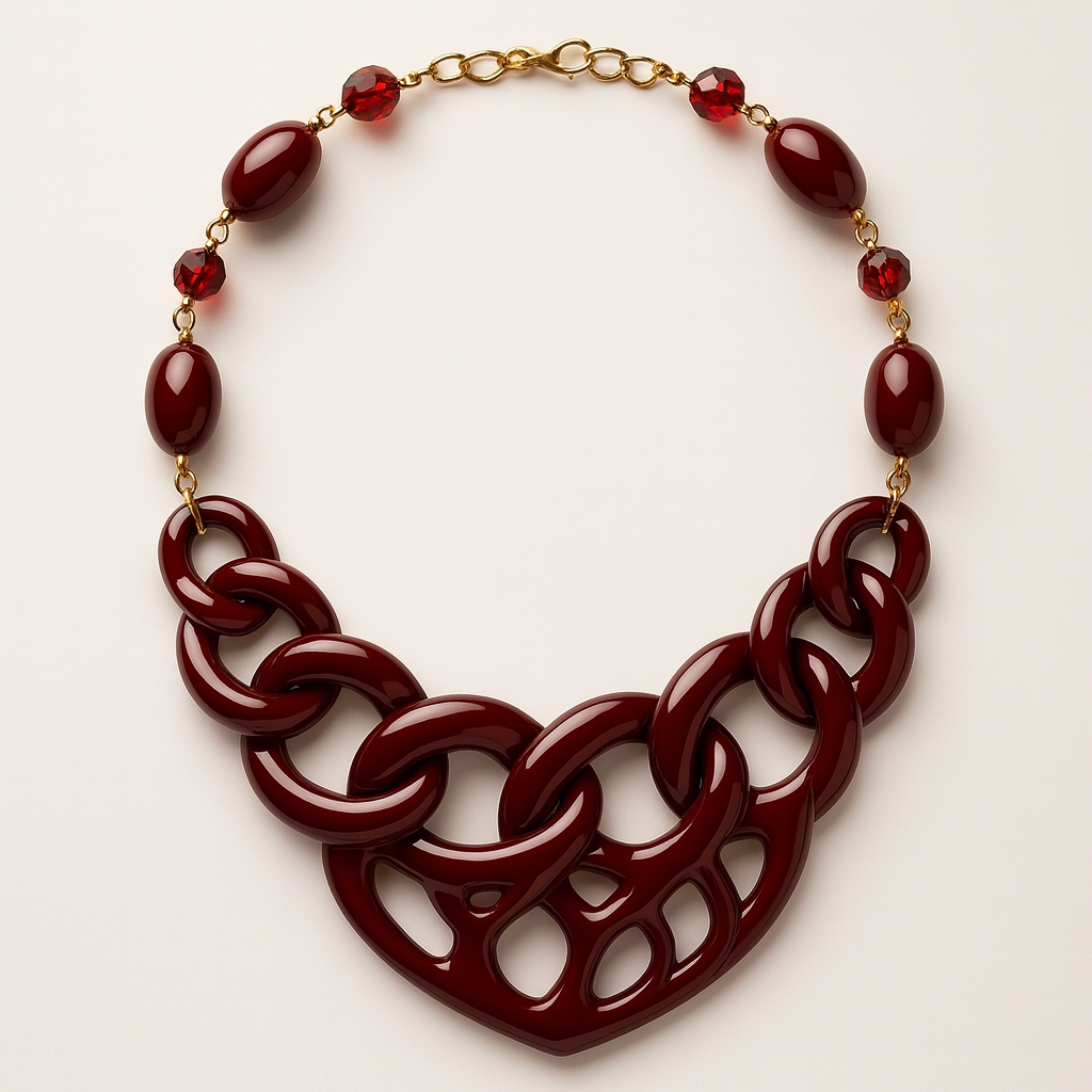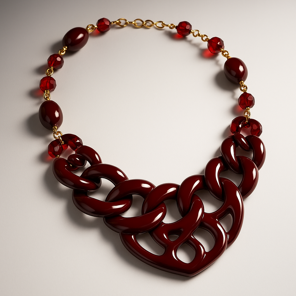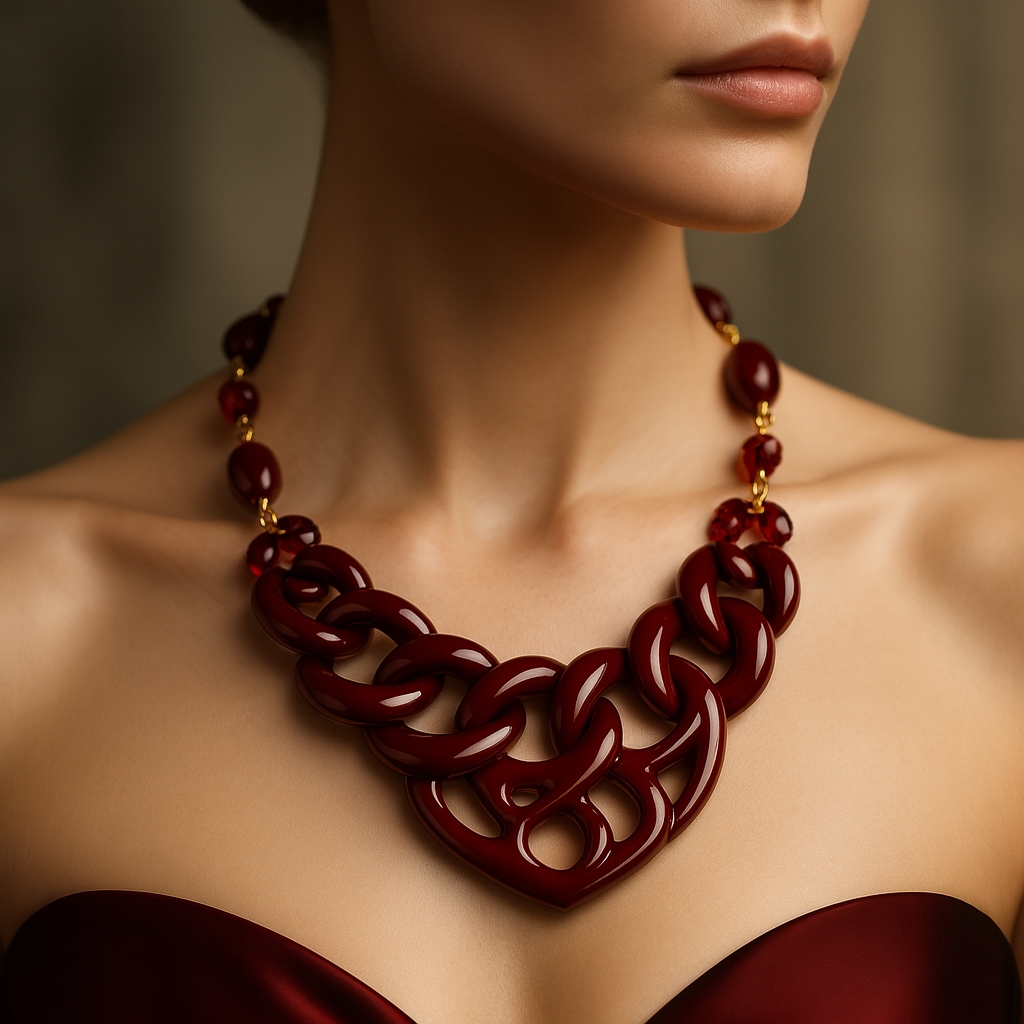 艶やかなレッドストーンと立体的なチェーンデザインが織りなすラグジュアリーネックレス。力強くも優美なフォルムが胸元を印象的に彩ります。